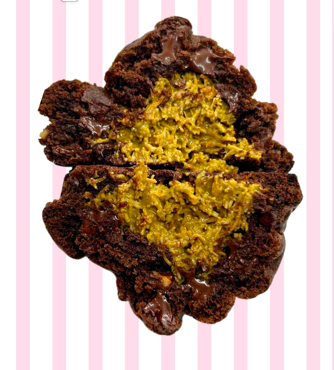 Experience a luxurious twist on chocolate cookies with our Dubai Cookie – a rich, chocolatey delight filled with crispy kataifi, smooth pistachio cream, and a hint of tahini for a perfectly balanced bite. ✨